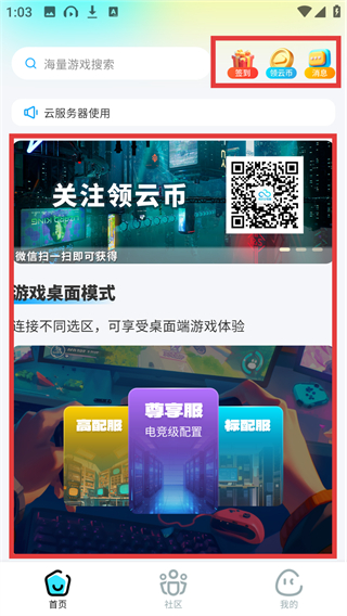 1、在游戏平台首页可点【签到】领云币,还能选不同配置的云服务器,开启桌面游戏体验哦。