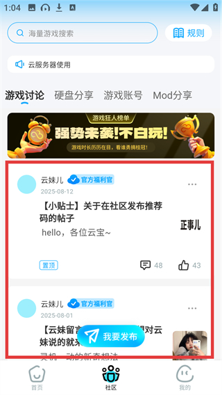 2、进入社区页能看到官方发布的帖子,比如【小贴士】类内容,也能点【我要发布】分享想法啦。