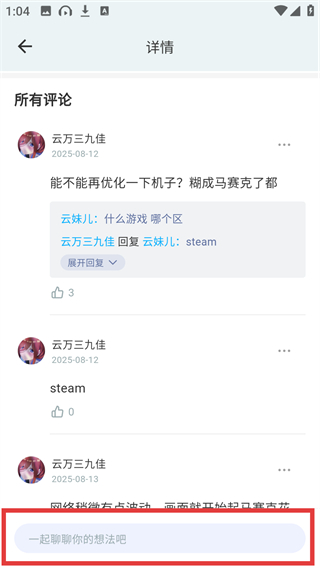 3、在帖子详情的评论区,点底部输入框就能输入想法,和其他用户交流游戏相关的内容哦。