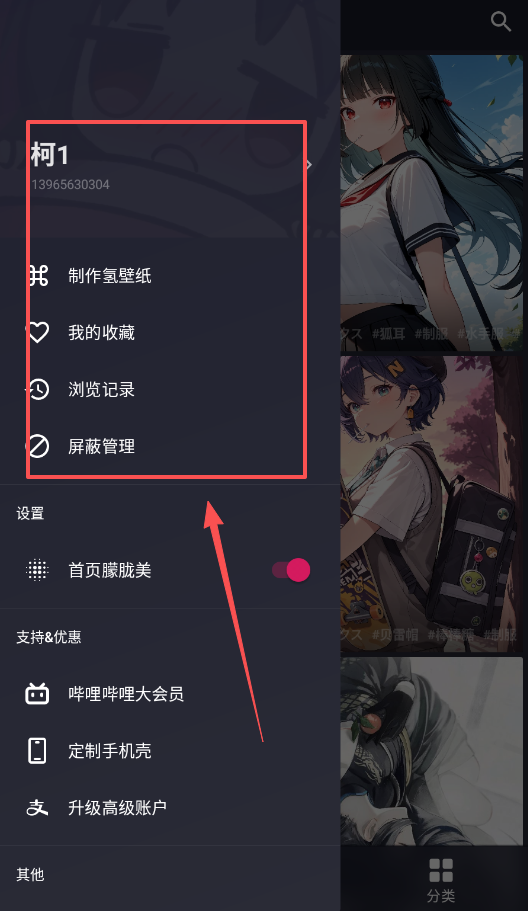 4、软件还提供哔哩哔哩大会员联动和定制手机壳服务,在设置里能找到升级高级账户的入口,通过发现和分类页面能持续获取新鲜壁纸。