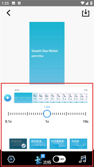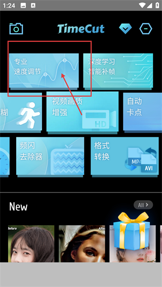 1、在TimeCut主界面点击【专业速度调节】功能,就能进入视频调速的编辑页面,开始调整视频速度啦。