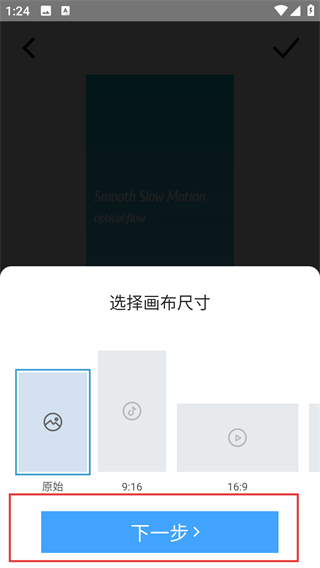 3、在画布尺寸选择界面选好比例后,点击【下一步】按钮,就能进入具体的速度调节界面啦。