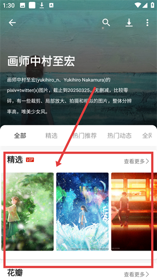 2、进入画师详情页后,在精选区域挑选喜欢的图片,点击进入图片详情页啦。