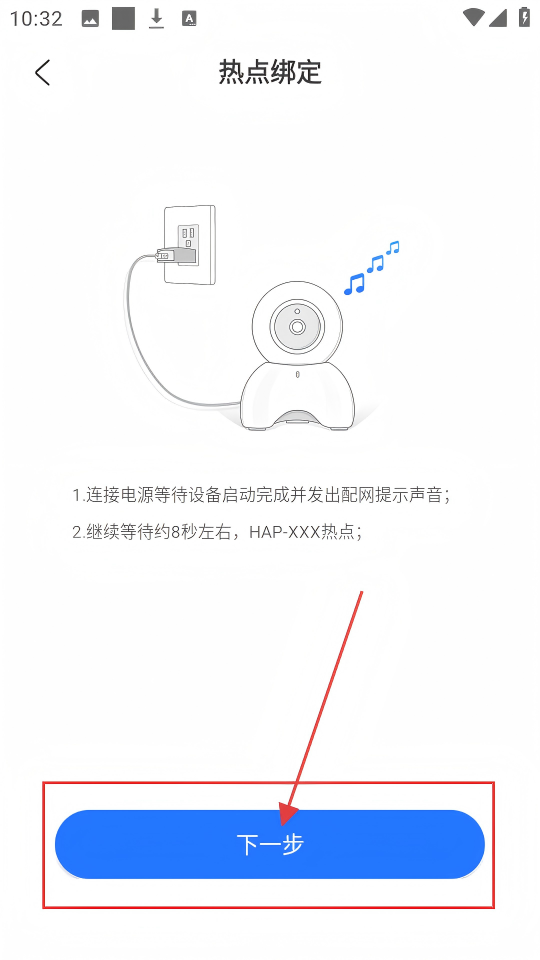 2、进入热点绑定页面,按提示连接电源等设备启动,然后点击【下一步】。