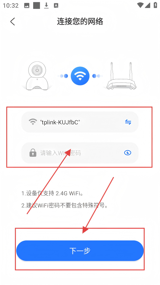 3、在连接网络页面,输入WiFi密码,确认无误后点击【下一步】继续操作。