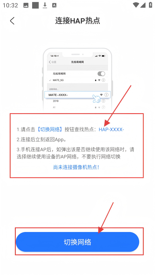 4、到连接HAP热点页面,按提示点击【切换网络】查找并连接热点,之后返回App。