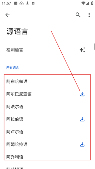 2、进入源语言选择页后能看到多种语言选项,比如【阿尔巴尼亚语】,可按需选择目标语言哦。