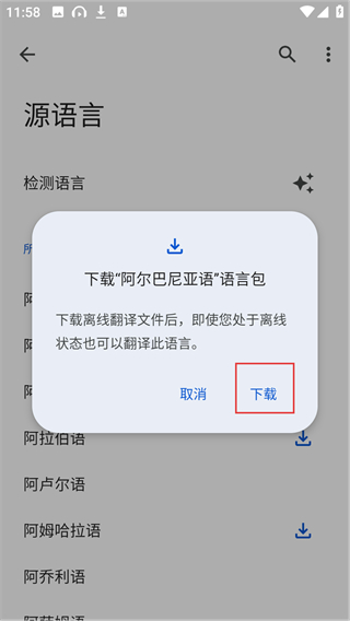 3、点【阿尔巴尼亚语】旁的下载按钮,会弹出下载提示框,点【下载】就能获取该语言包啦。