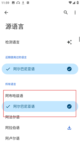 4、下载完成后【阿尔巴尼亚语】会显示勾选状态,成功将其设为翻译的源语言类型哦。