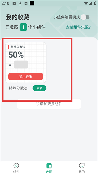 4、进入【收藏】界面,能看到已收藏的【特殊分数法】组件,点击【安装】即可添加到桌面哦。