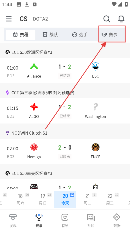 1、打开赛事页面,点击【赛事】选项,进入赛事列表页面,可浏览不同赛事信息啦。