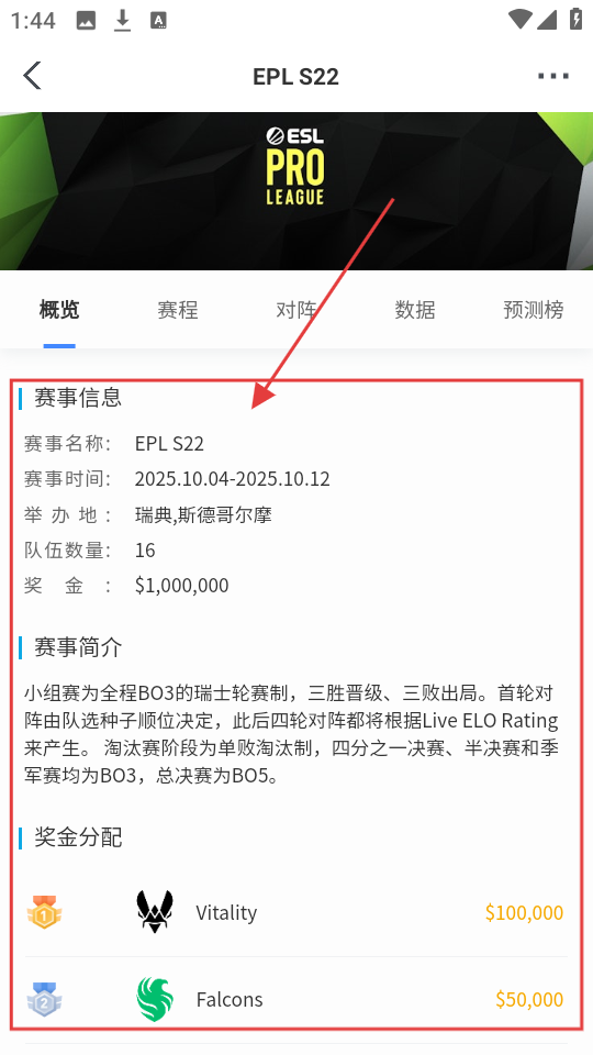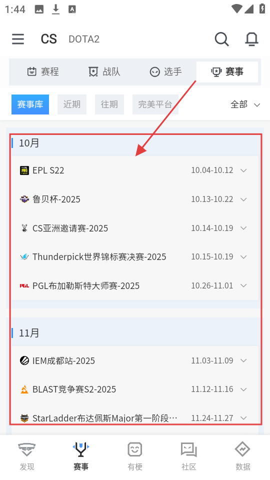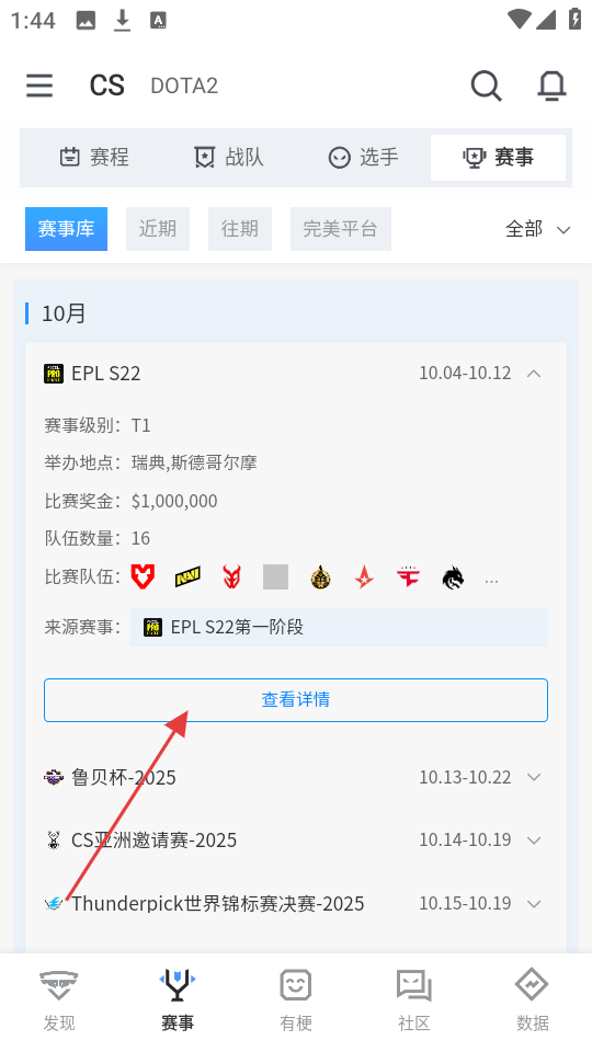 2、在赛事列表页面,查看各月份的赛事安排,找到想了解的赛事,比如EPLS22,准备查看详情哦。