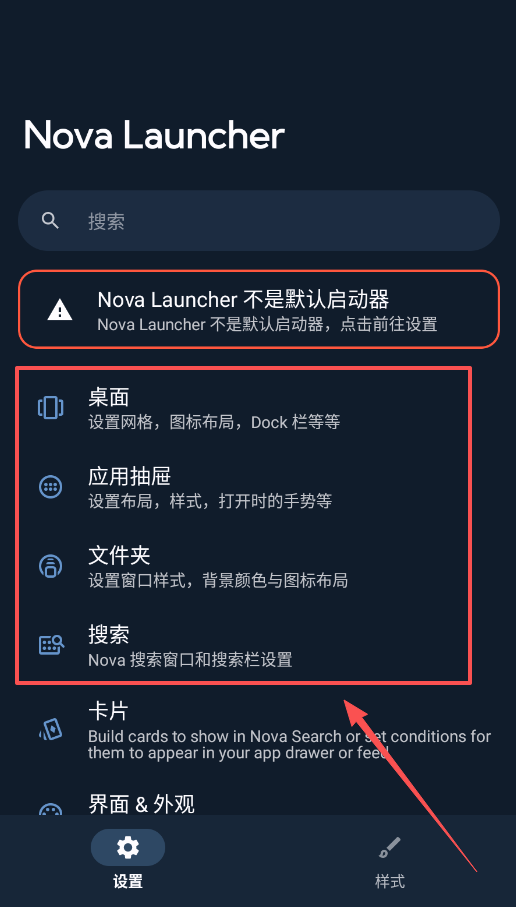 1、首先,如果你想使用Nova启动器的话,记得前往手机系统设置,将“默认启动器”更改为Nova Launcher,否则许多功能无法生效。