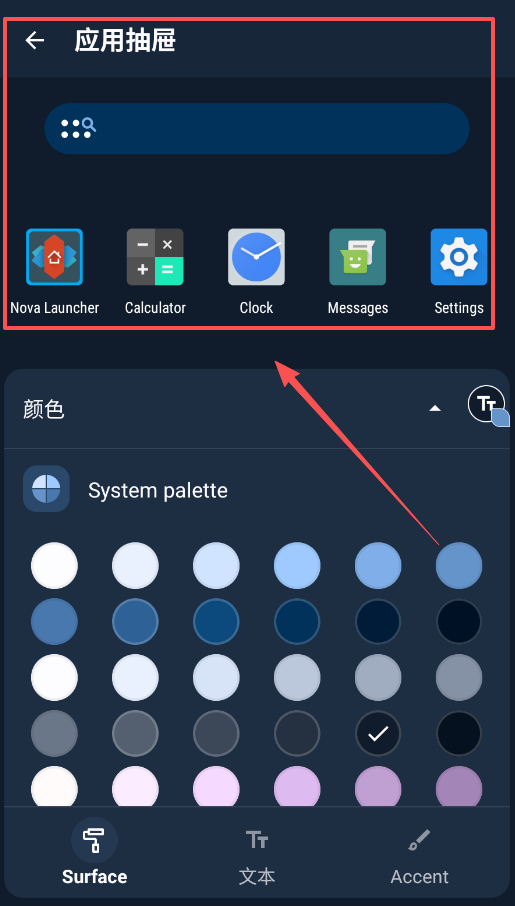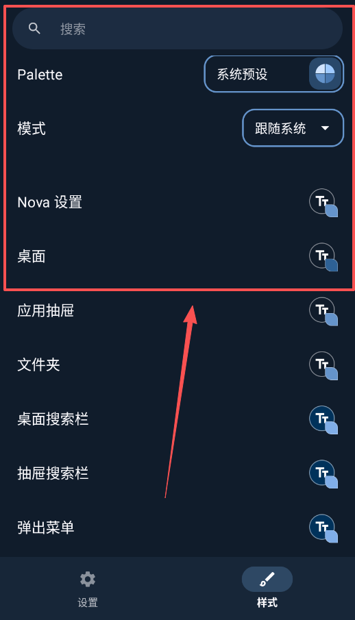 2、Nova的搜索功能支持多种视觉自定义,在“样式”菜单里,你可以使用“颜色选择器”来调整主题,有跟随系统、预设或手动模式可选。