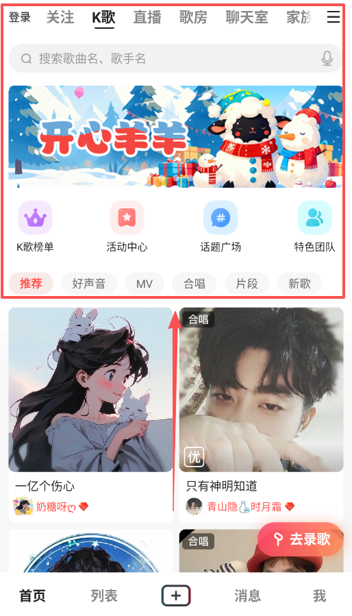 4、在首页向下滑动,就能浏览“推荐”流里的各种视频,包括好声音、MV、合唱等不同频道,遇到喜欢的可以直接点击合唱按钮参与互动。