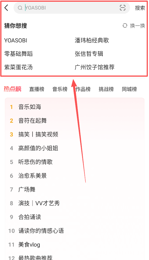 3、想快速找到热门歌曲或内容,可以点击搜索框,系统会根据你的喜好推荐“猜你想搜”,还有实时更新的“热点榜”供你参考呢。