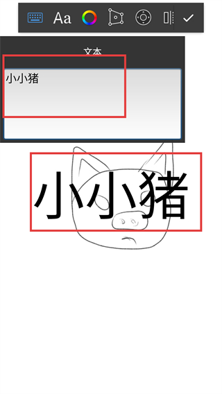 4、在文本输入框中输入内容(比如【小小猪】),输入完成后文字会显示在画作上,就能完成文字添加啦。