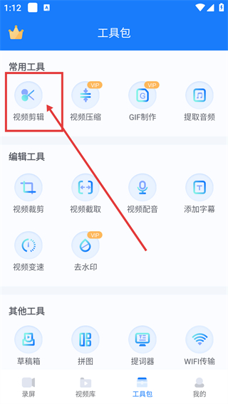 1、在工具包页面点击【视频剪辑】选项,就能进入视频剪辑的编辑页面,准备对视频进行创作啦。