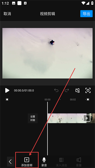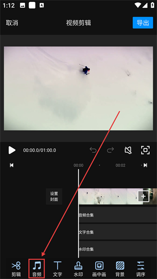 2、进入视频剪辑页后,点击底部的【音频】选项,就能打开音频编辑的功能栏,准备给视频加音频哦。