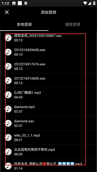 4、在添加音频页选择【本地音频】分类下的音频文件,点击就能将其添加到视频中啦。