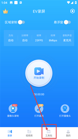 1. 安卓手机打开EV录屏,点击工具包