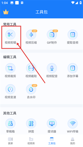 2、进入工具包后,点【视频剪辑】选项,就能进入视频编辑页面,开始对视频进行剪辑操作哦。