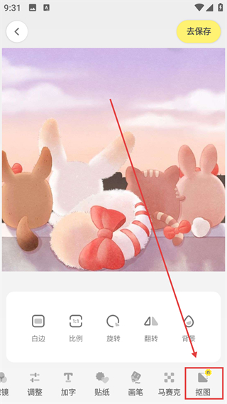 1、进入图片编辑界面后,点击底部的【抠图】选项,就能开启对当前图片的抠图操作啦。