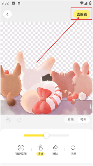2、在抠图界面完成选区后,点击右上角的【去编辑】按钮,就能进入抠图后的编辑环节哦。