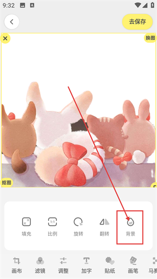 3、进入编辑页后,点击底部的【背景】选项,就能打开背景设置的面板来更换背景啦。