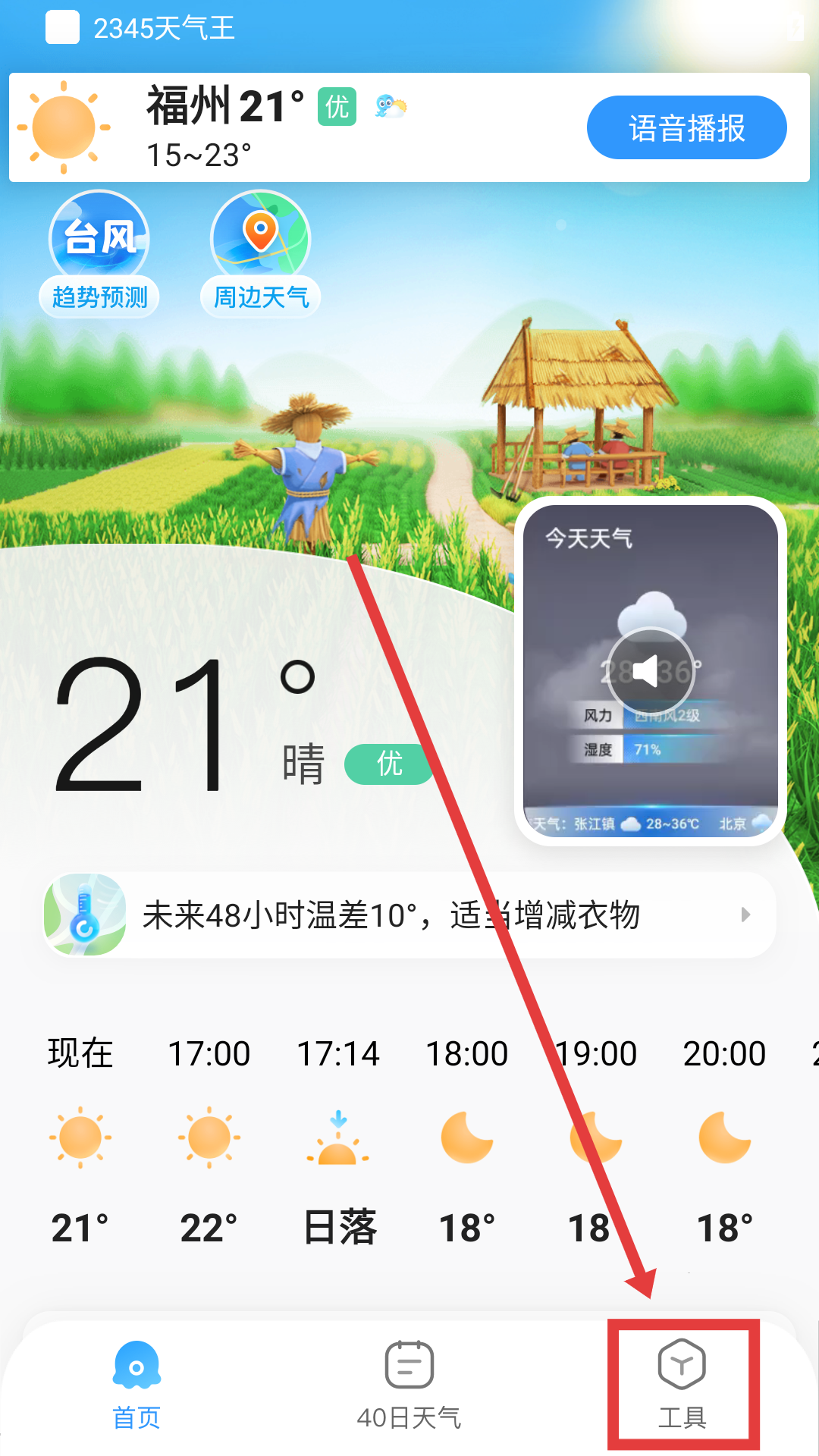 1、在天气应用首页,点底部【工具】,可进入工具界面使用更多功能哦。