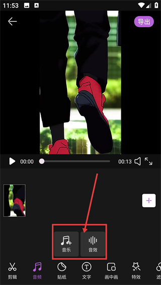 4、点底部【音频】选项,就能打开【音乐】【音效】功能,给视频添加合适的音频素材哦。