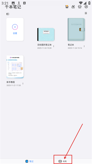 1、在【千本笔记】首页,点击底部的【卡片】标签,切换到卡片管理界面,可查看或创建知识卡片啦。