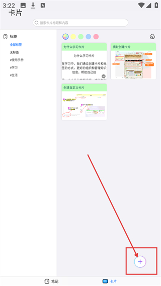 2、进入卡片页面后,点击右下角的加号按钮,进入创建卡片的编辑界面,准备制作新卡片哦。
