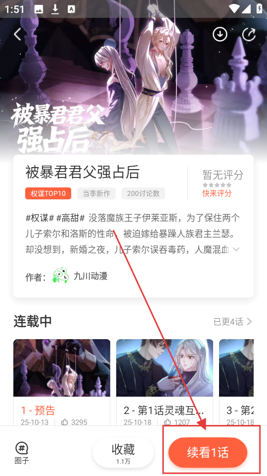 2、进入漫画详情,点击【续看1话】,就能继续阅读精彩内容,超方便的哟。