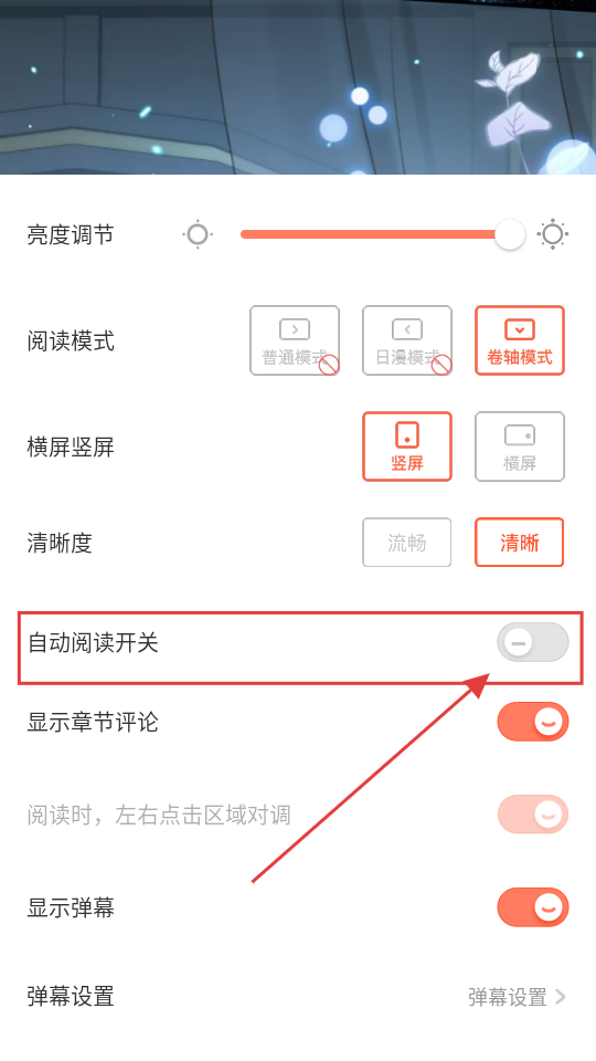 4、在设置里找到【自动阅读开关】,开启后就能自动阅读漫画,解放双手超惬意的呢。