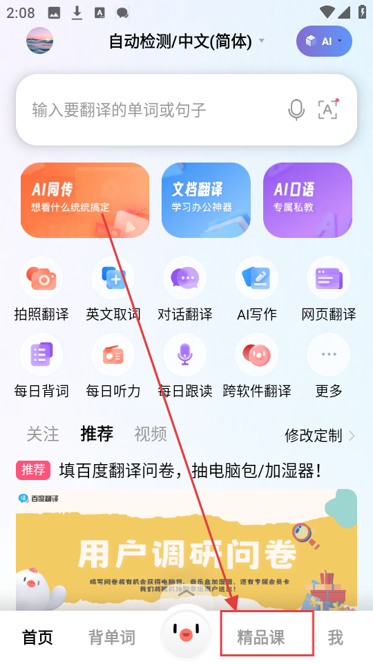 1、我们进入软件,若想查看精品课程,点击【精品课】,就能进入精品课页面啦。