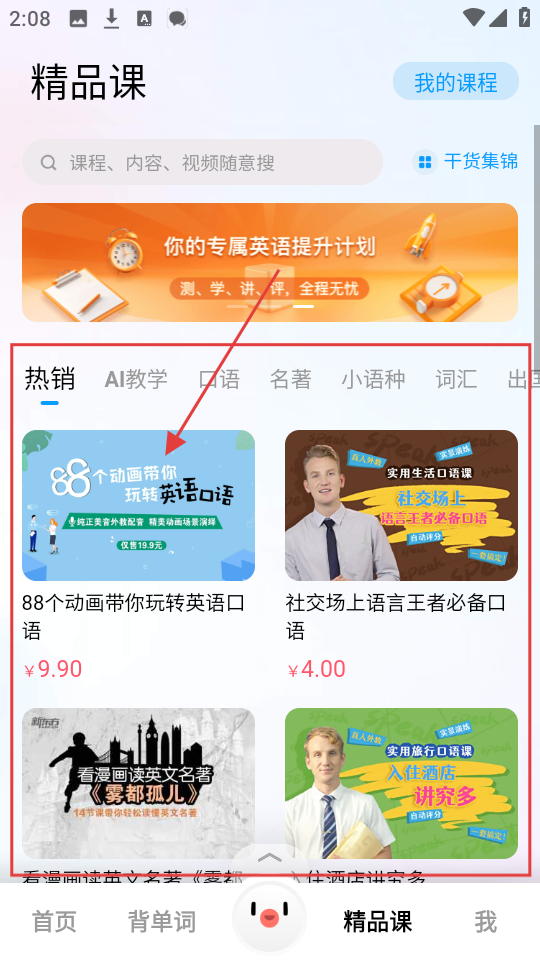 2、在精品课页面,若想选择感兴趣的课程,比如“88个动画带你玩转英语口语”,点击该课程,就能进入课程详情页面哦。