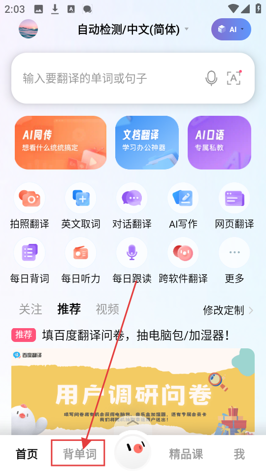 1、打开APP首页,点击底部【背单词】选项,进入背单词页面,准备定制学习计划啦。