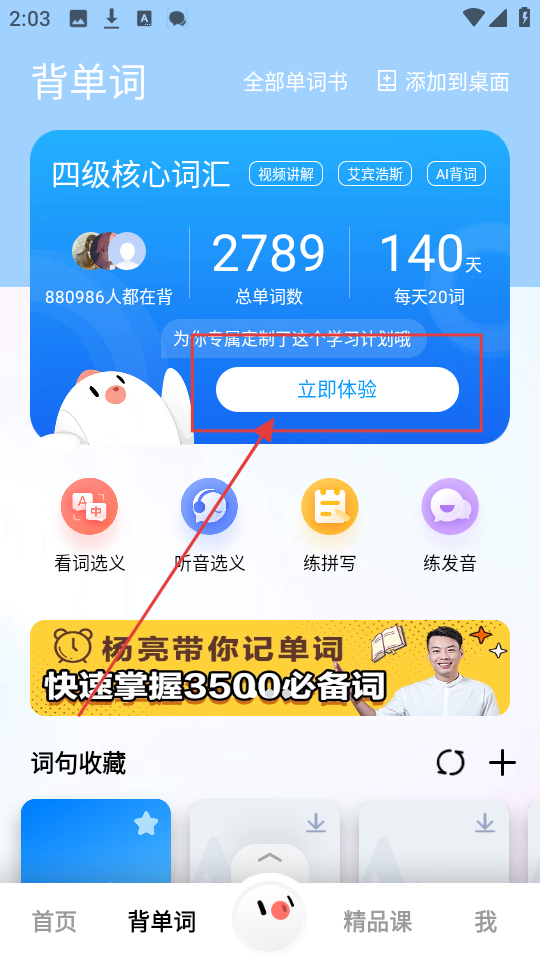 2、在背单词页面,找到目标词汇书,比如四级核心词汇,点击【立即体验】,进入学习计划设置页面哦。