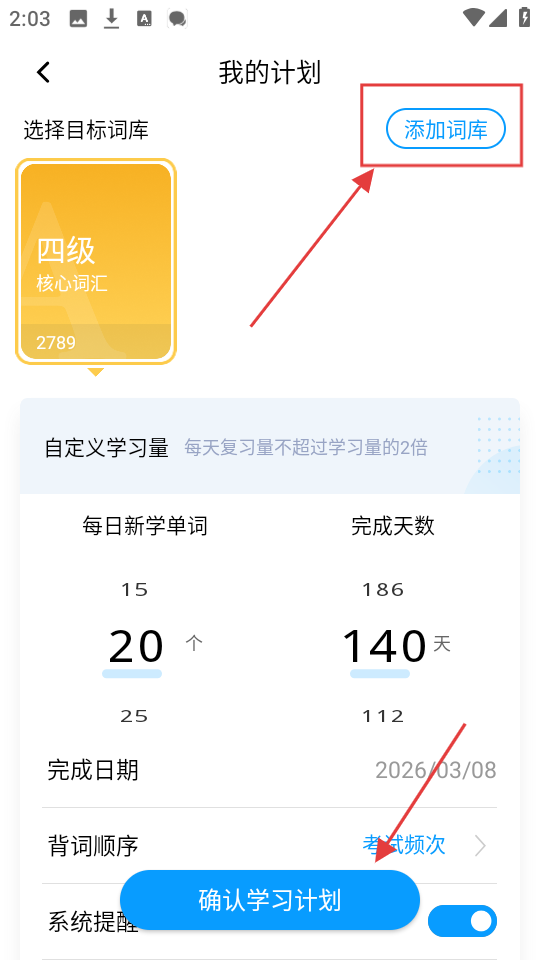 4、选好词库后,确认每日学习量、完成天数等学习计划内容,然后点击确认按钮,完成背单词计划定制啦。
