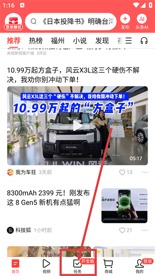 1、我们打开今日头条这个软件,在首页界面,点击上方【搜索框】;