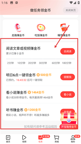 2、进入任务页后,可看到【阅读文章或视频赚金币】等任务,点击对应按钮就能完成任务得金币哦。