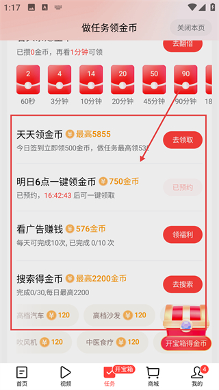 1、在首页点击底部的【任务】选项,就能进入做任务领金币页面,参与各类任务获取奖励啦。