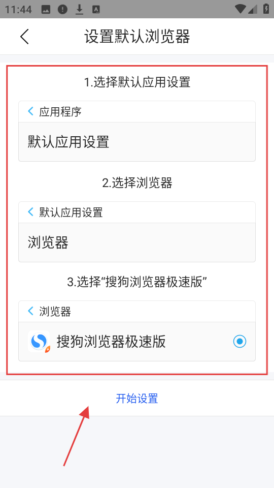 4、进入设置默认浏览器页面,能看到设置步骤和选项,点击【开始设置】,便可按指引设置默认浏览器啦。