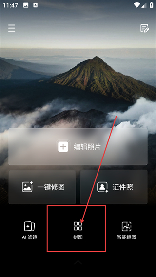 1、在修图工具首页点击【拼图】选项,就能进入拼图编辑页面,准备将多张图片拼接成新作品啦。