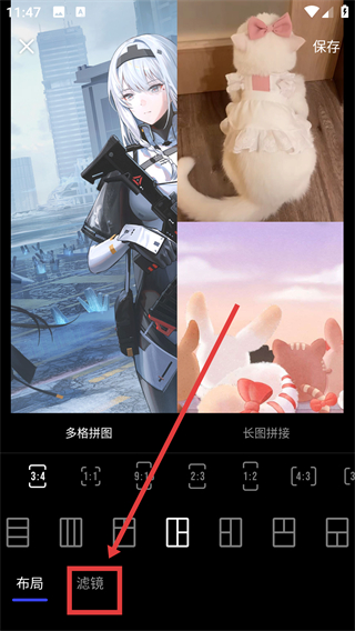 3、选好拼图布局后,点击【滤镜】选项,就能打开滤镜选择界面,给拼接好的图添加滤镜效果哦。