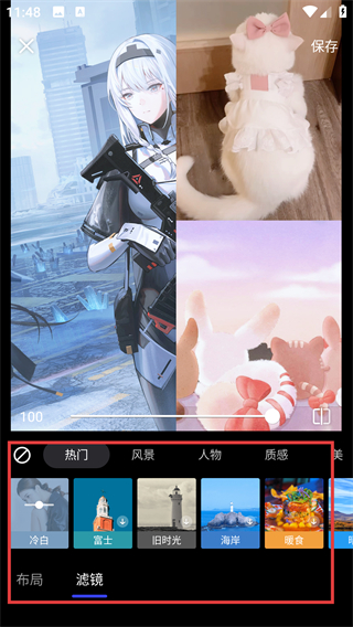 4、在滤镜页选择热门分类下的滤镜,比如【冷白】【富士】,应用后就能让拼图更有质感啦。