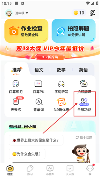 1、在首页点击【全部功能】选项,就能进入功能汇总页面,找到各学科对应的学习工具啦。