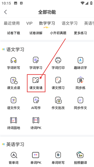 2、进入全部功能页后,在语文学习分类里点击【课文背诵】,就能进入对应的课文列表页面啦。
