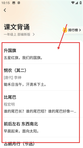 3、在课文背诵页能看到对应年级的课文列表,比如【升国旗】【悯农(其二)】等内容,可按需选择哦。